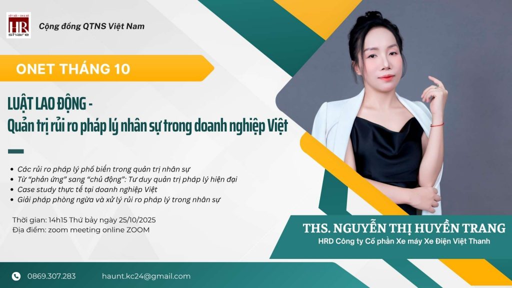 Nhiều anh chị chưa biết, hiểu, nắm rõ luật/quy định mới năm 2025, ….Nên em Hậu đã mời Ths. Nguyễn thị Huyền Trang – HRD Công ty Cổ phần Xe máy Xe Điện Việt Thanh – để chia sẻ tới cộng động về “Từ tuân thủ sang chủ động: Quản trị rủi ro pháp lý nhân sự trong doanh nghiệp Việt”